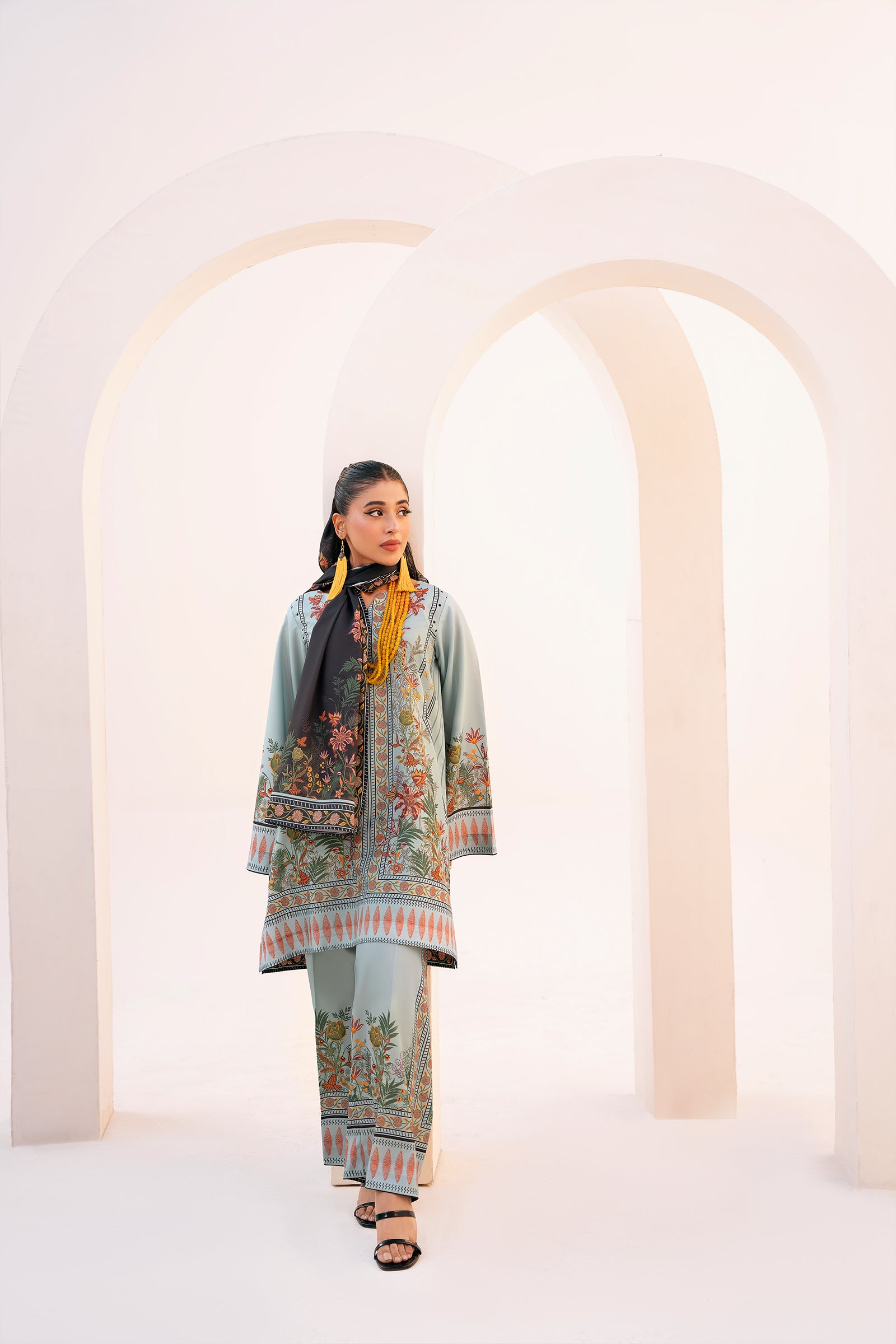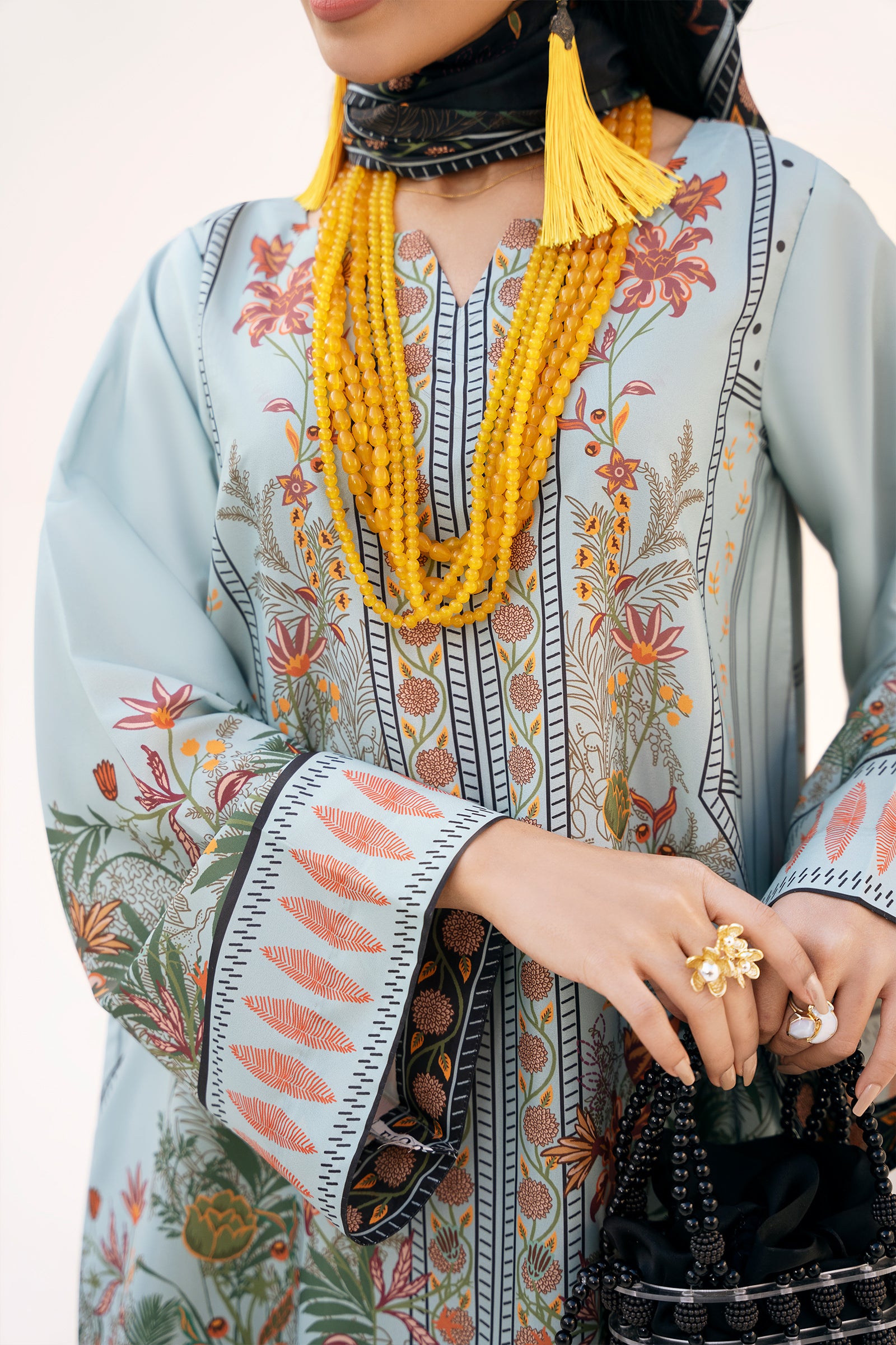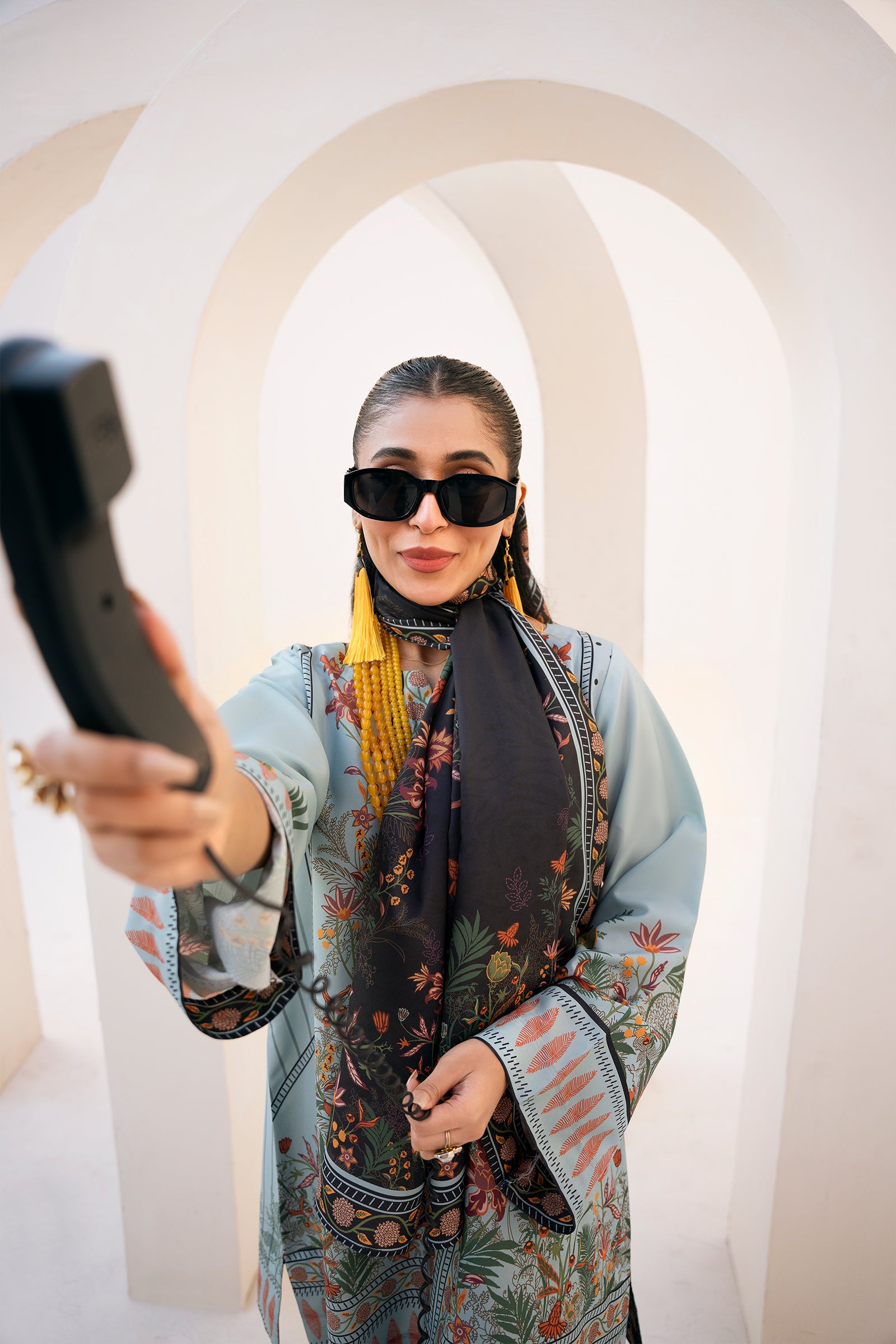 A soft ice blue short shirt ensemble with beautiful print details. The silk set comes with a complimentary scarf and is perfect for the season.